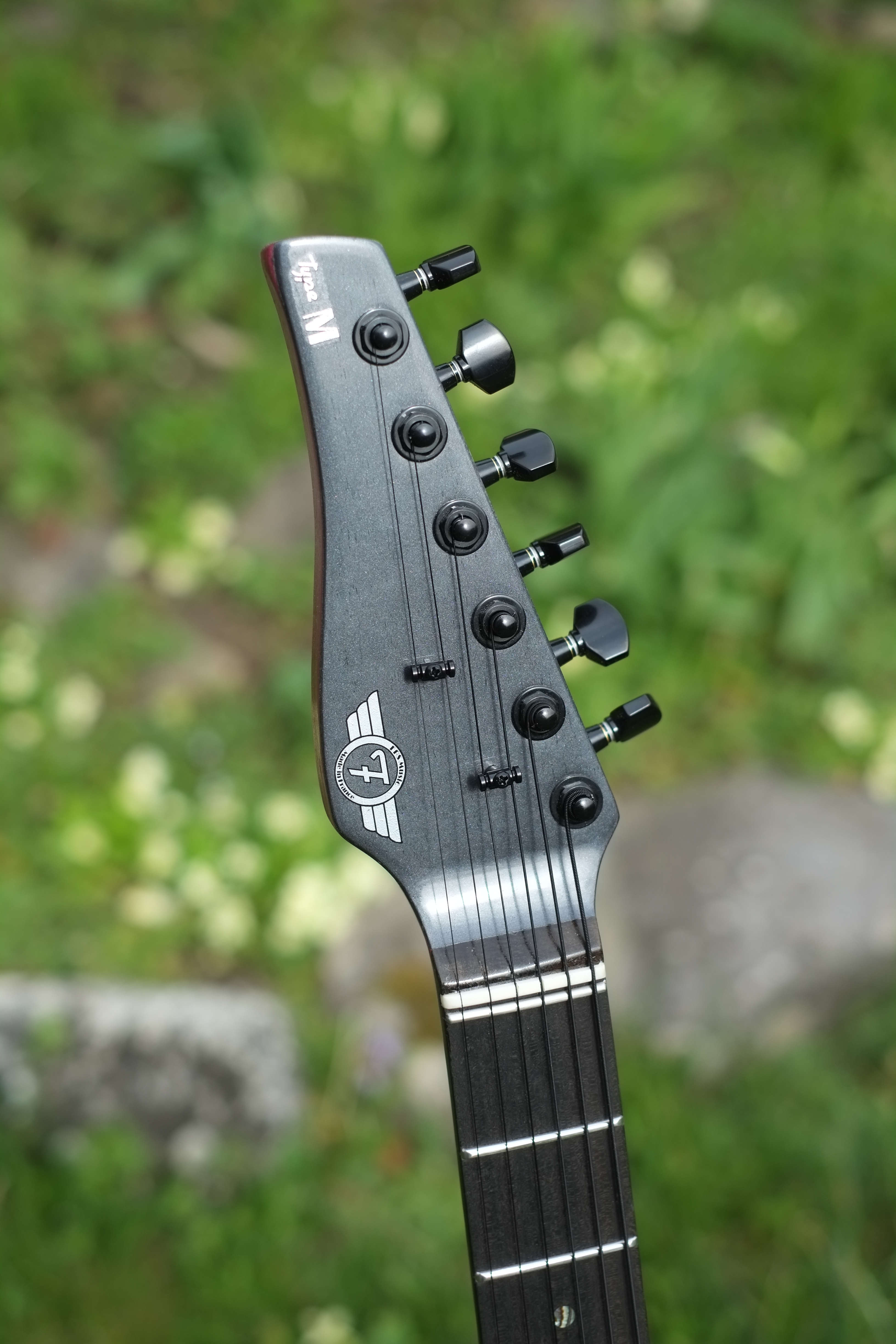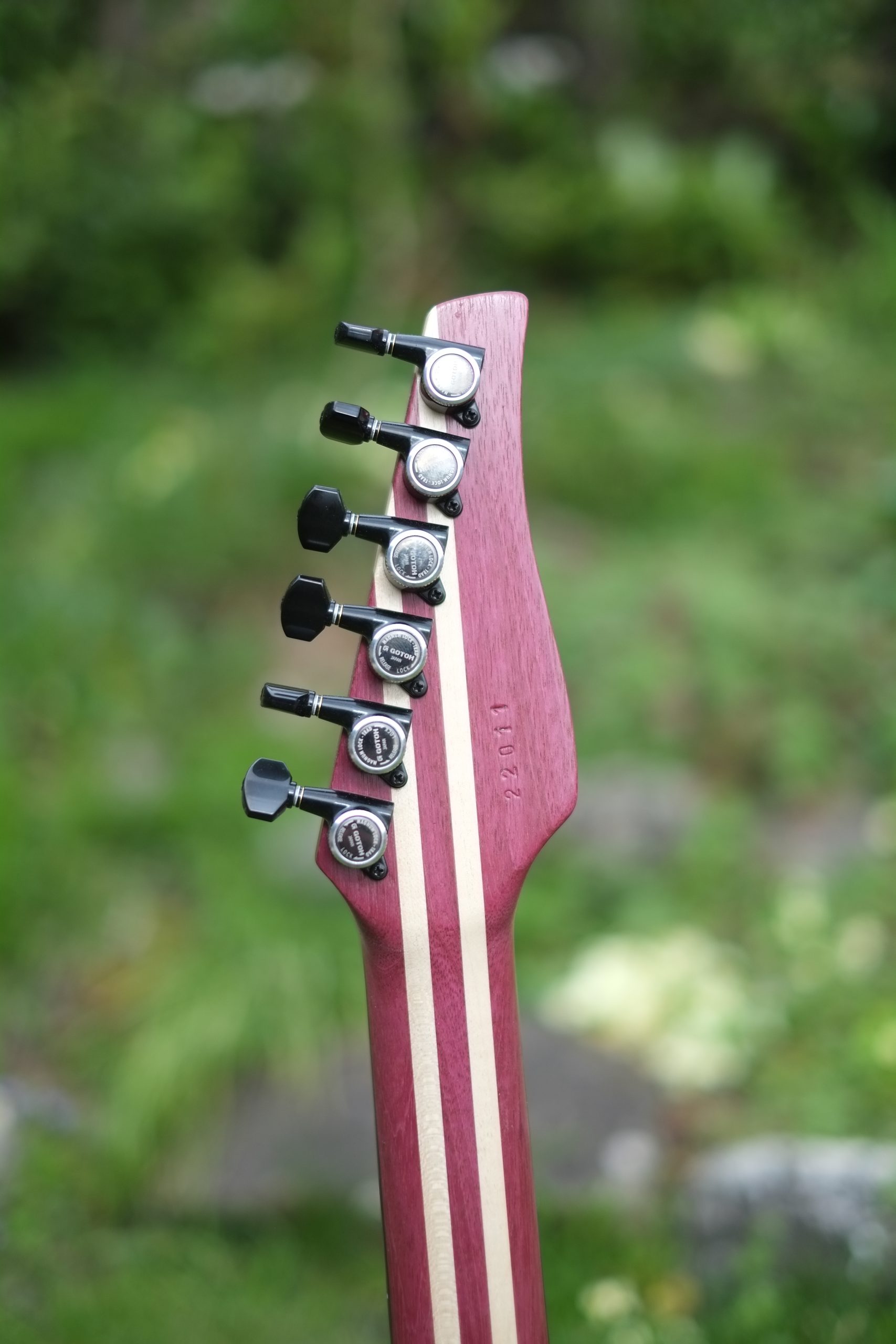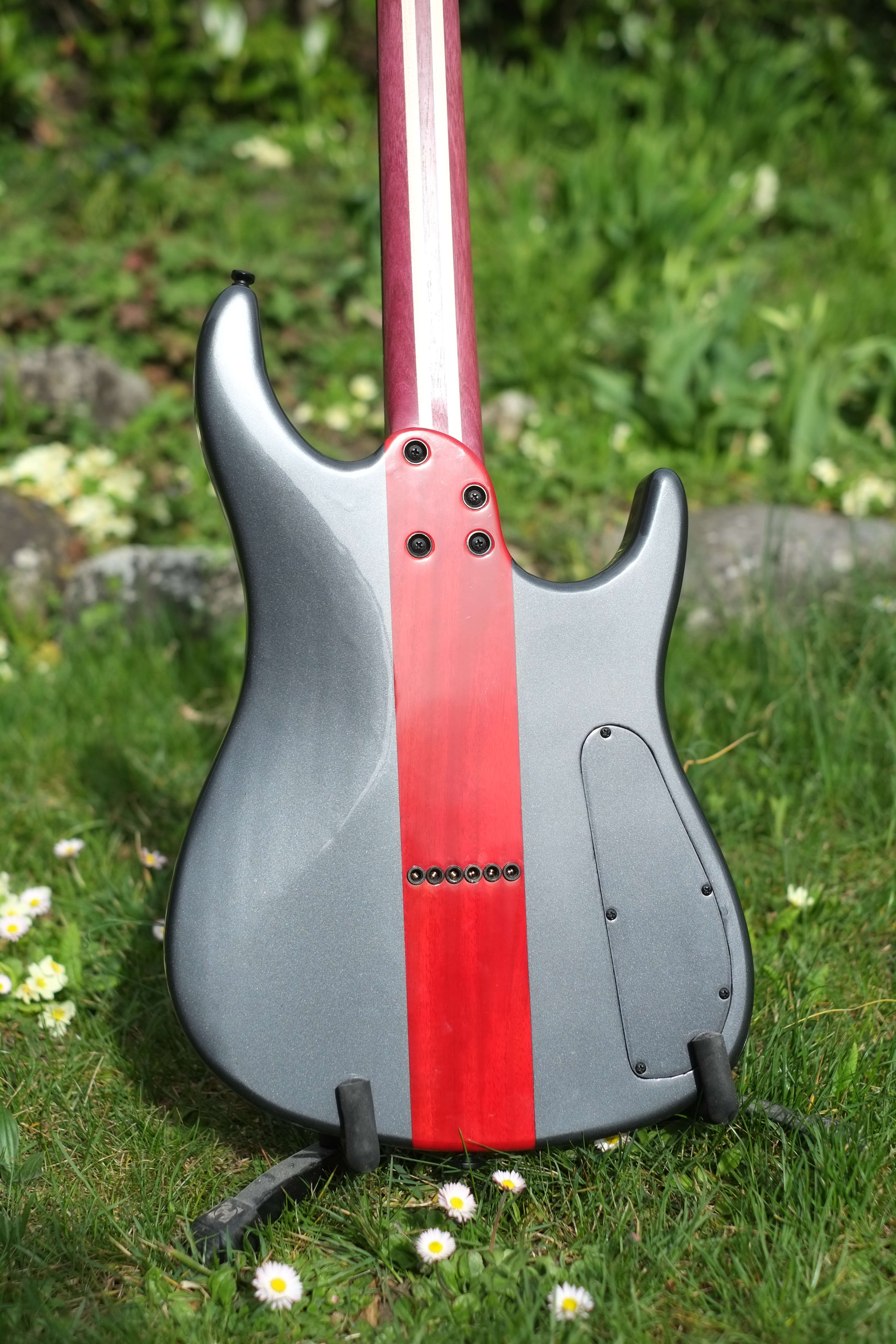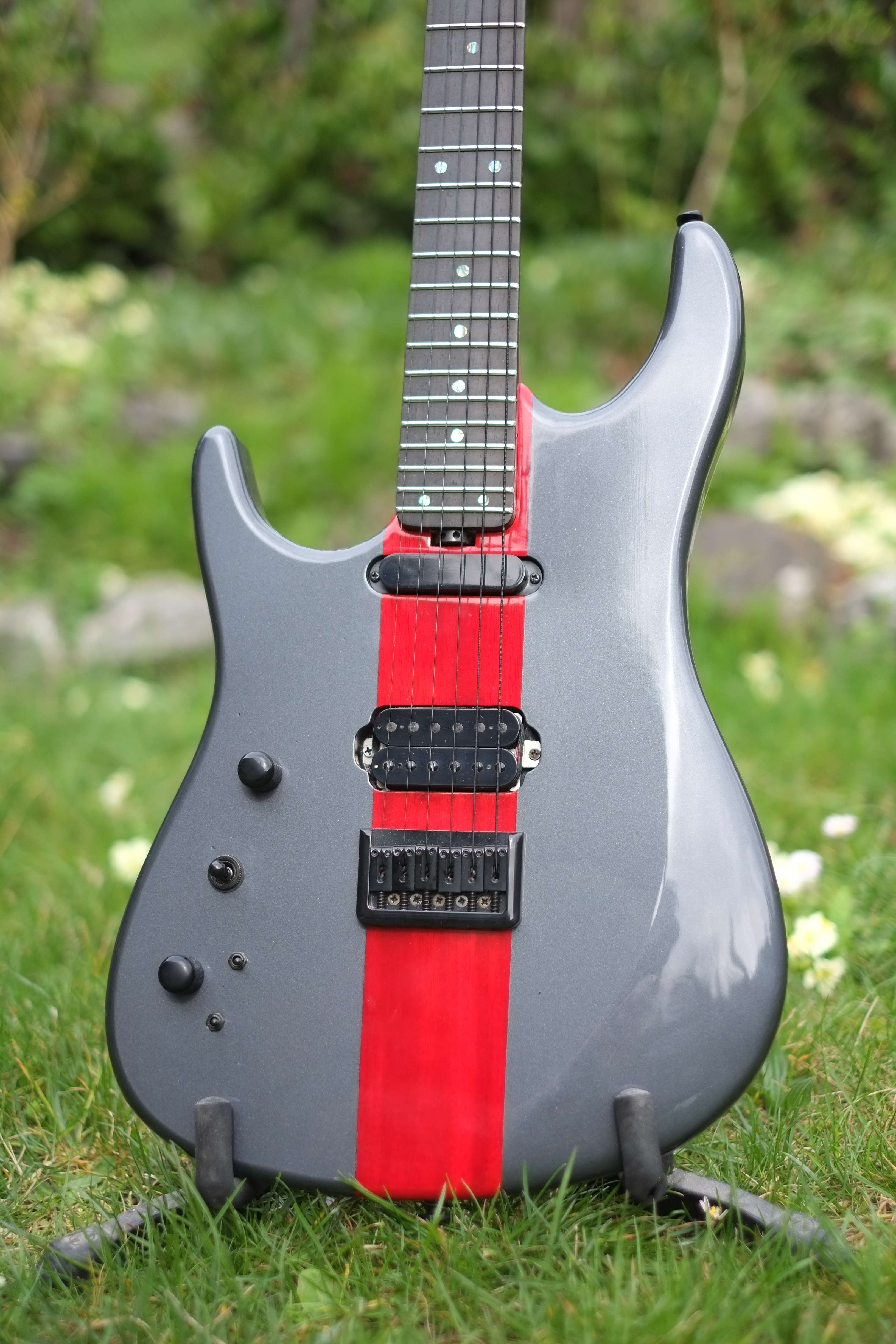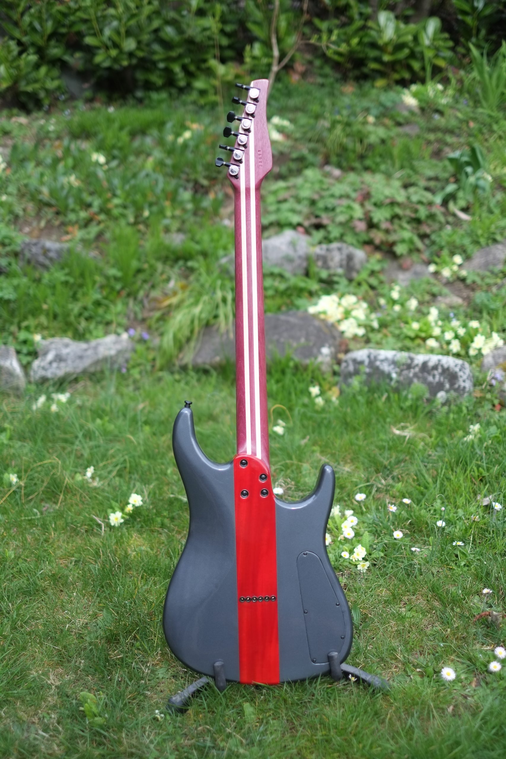 - finition du corps charcoal black (metallisé) avec bande centrale rouge translucide pour l’acajou, manche huilé (la tête matched headstock)